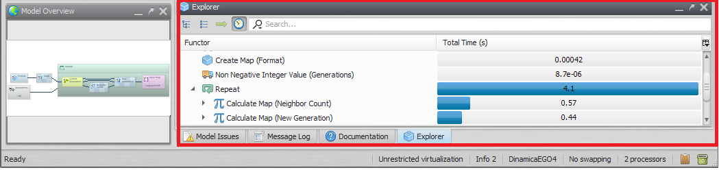 Shows all functors present on the current model, according to their hierarchy inside the model. It can show the total time spent by each functor.