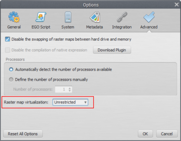 The virtualization process is mostly automatic and happens by simply passing maps with different extents and resolutions to any functor. However, the user can limit the virtualzation process by checking the options available on “Tools → Options | Advanced | Virtualization”. Basically, the user can choose one of the following options.