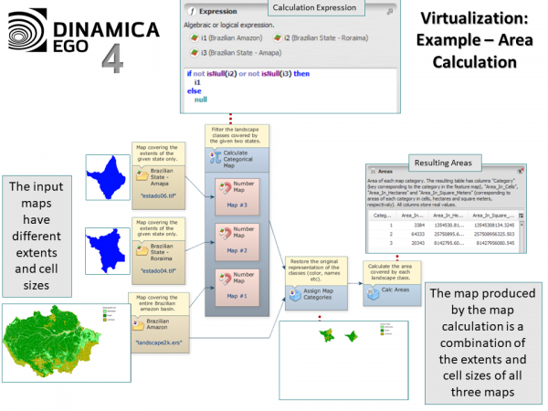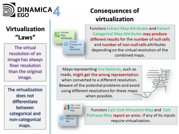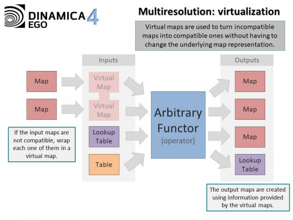 Image virtualization, map virtualization, or even raster virtualization is the name given by Dinamica EGO 4 to the ability of manipulating images with different extents, resolutions or number of lines and columns.