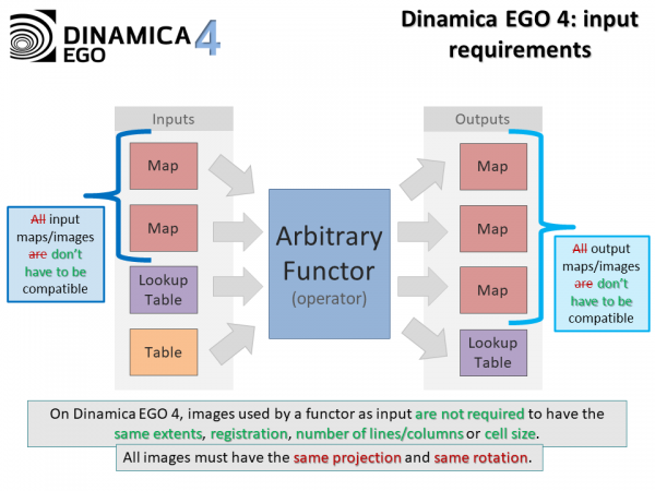 Versions of Dinamica prior to version 4 could only manipulate maps with the same number of lines and columns. Additional information such as registrations coordinates, resolution etc were not treated uniformly by all functors with many of them simply ignoring this information in the input maps.