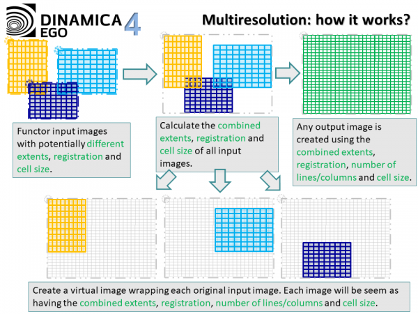 Image virtualization, map virtualization, raster virtualization or even multi-resolution are the names given by Dinamica EGO 4 to the ability of manipulating images with different extents, resolutions or number of lines and columns.
